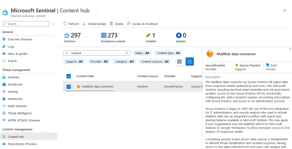 The MailRisk data connector is published in the Azure Marketplace, and is available for install via the Sentinel Content Hub (search for MailRisk):